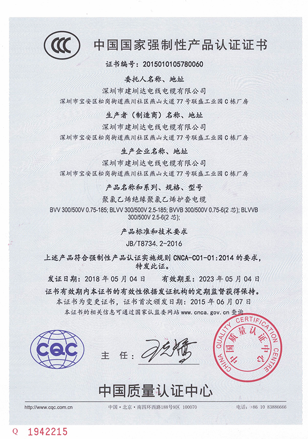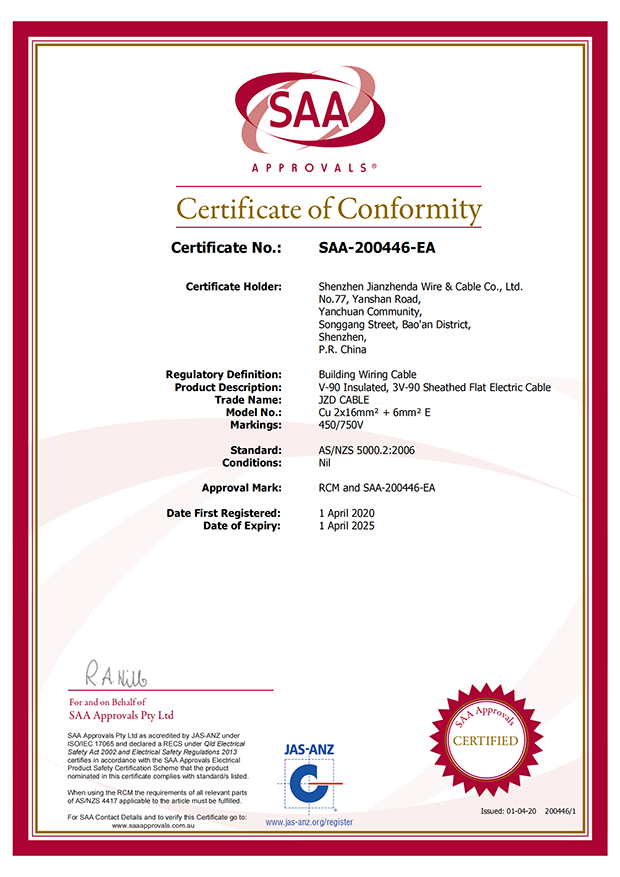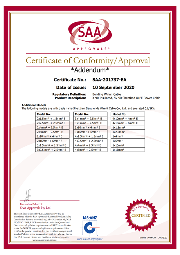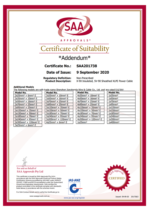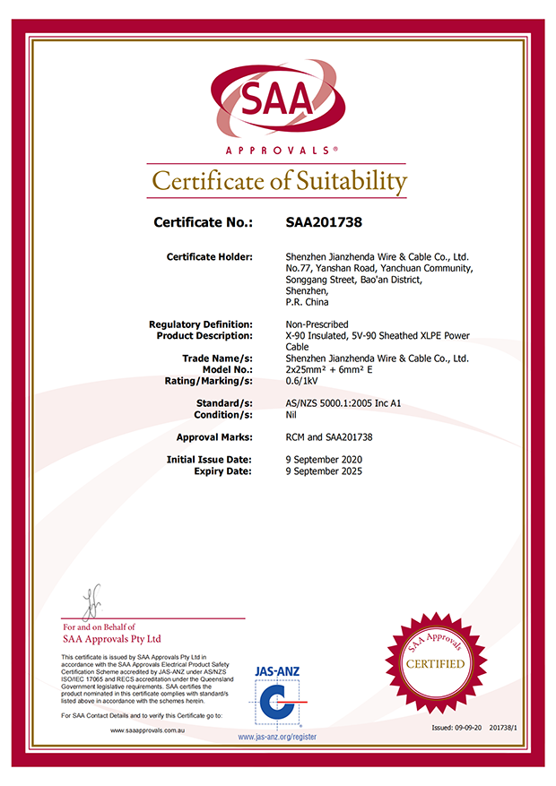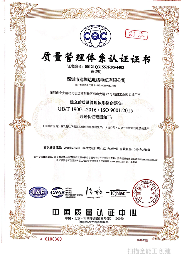 深圳建圳達電線電纜有限公司,成立于2000年,是一家電線電纜制造商,我們通過了世界各地不同市場的多數(shù)認證,如:CCC、RoHS、CB、SAA、TUV、VDE、PSE、BPS、UL、CSA。我們根據(jù)定制產(chǎn)品不斷更新新的認證。經(jīng)過數(shù)十年的發(fā)展,我們與來自世界各地的客戶建立了長期的合作關(guān)系。我們曾經(jīng)是菲律賓機場,,柬埔寨的電力站,美國的醫(yī)院,工廠,埃塞俄比亞的水電站項目。我們是一家值得信賴的電線供應商。